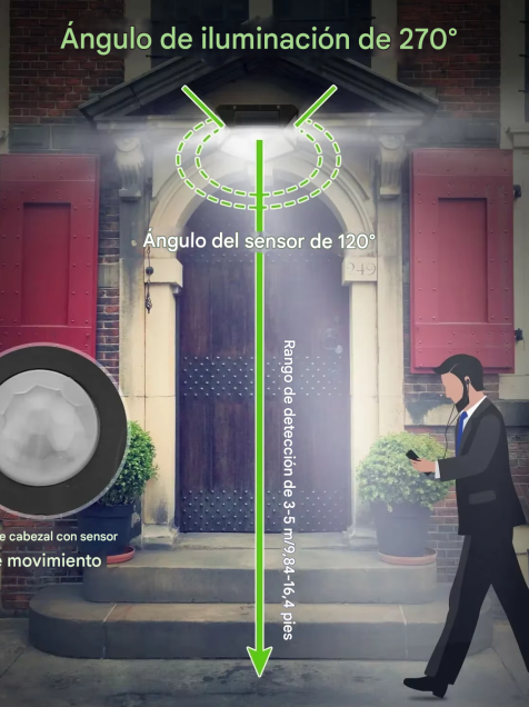 3. 【Más sensible con la tecnología PIR】Nuestras luces solares de movimiento cuentan con la excelente tecnología PIR que permite la funcionalidad de detección de movimiento a una distancia de hasta 3-5 metros en un gran ángulo de 120° en un tiempo de respuesta rápido.