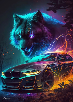 Póster coche Animal Cyberpunk neón estética Lobo pintura lienzo arte pared decoración habitación