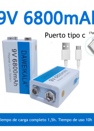 Batería recargable iones litio Pila 9V 6800mAh tipo C juguete electrónicos médicos USB azul blanco