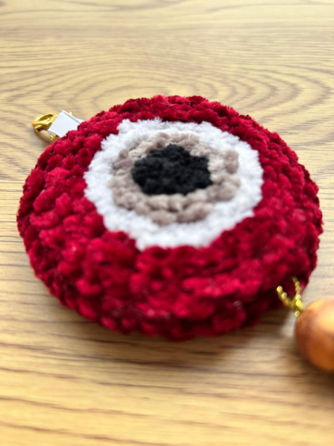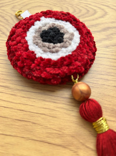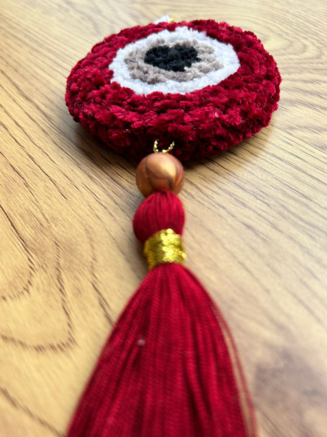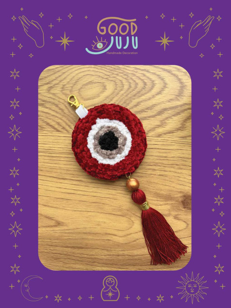 Símbolo de protección, buena salud y buenas energías, es considerado un amuleto poderoso que protege contra la mala suerte y el mal de ojo. Puedes colgarlo en tu bolsa o en tu llavero, hecho a mano con la técnica "Punch Needle" de 8 cms de diámetro, hecho de estambre 50% algodón 50% acrílico.
