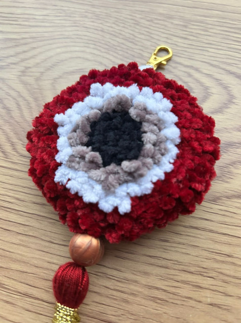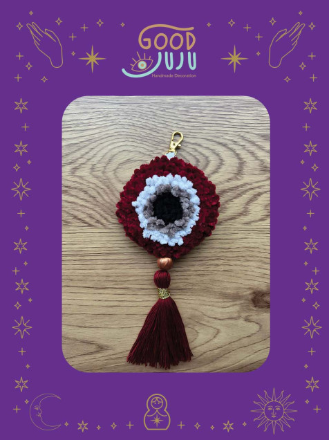 Símbolo de protección, buena salud y buenas energías, es considerado un amuleto poderoso que protege contra la mala suerte y el mal de ojo. Puedes colgarlo en tu bolsa o en tu llavero, hecho a mano con la técnica "Punch Needle" de 8 cms de diámetro, hecho de estambre 100% acrílico.