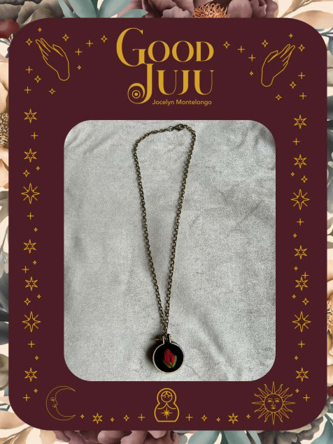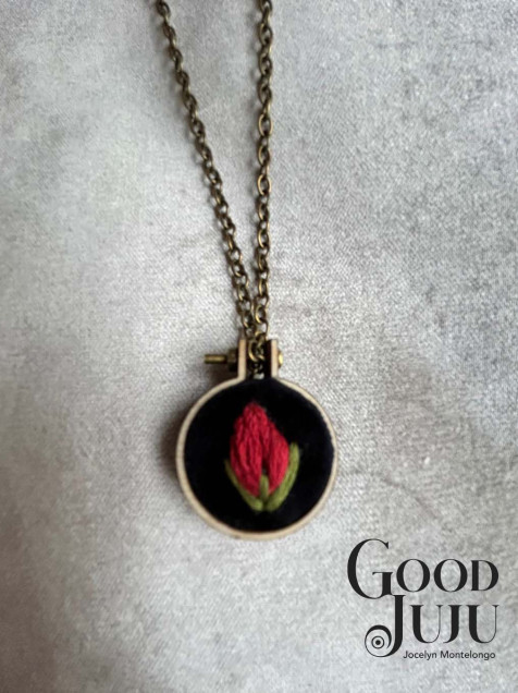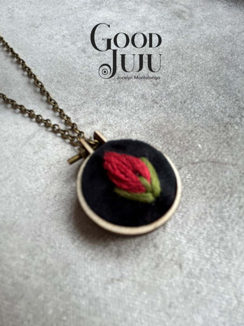 Dije en forma de aro de bordado de madera de 2 cms de diámetro, el bordado sobre terciopelo negro está hecho con hilos de algodón de la marca DMC y Anchor , incluye cadena de latón con una tonalidad en oro antiguo de 22 cms de largo.