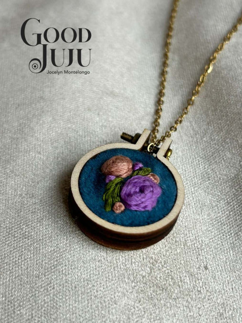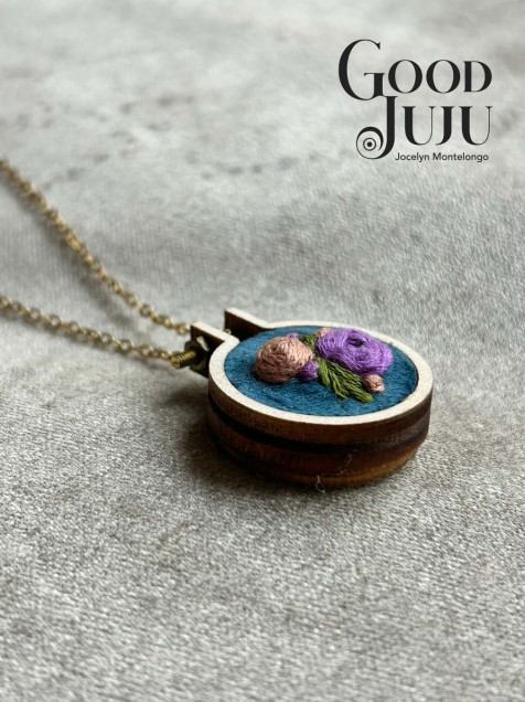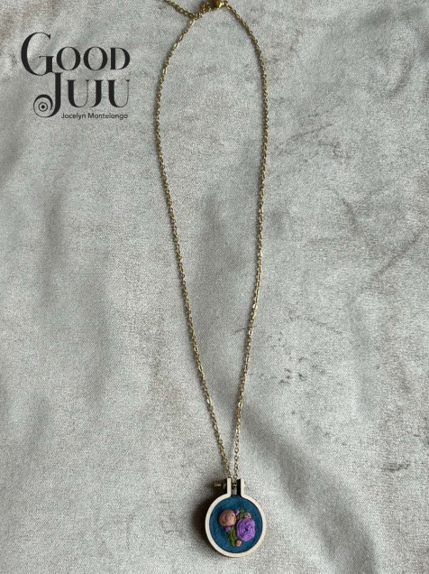 Dije en forma de aro de bordado de madera de 2 cms de diámetro, el bordado sobre terciopelo azul está hecho con hilos de algodón de la marca DMC Y Anchor, se incluye cadena de acero inoxidable de 22 cms de largo, perfecta para lucir este accesorio con estilo.