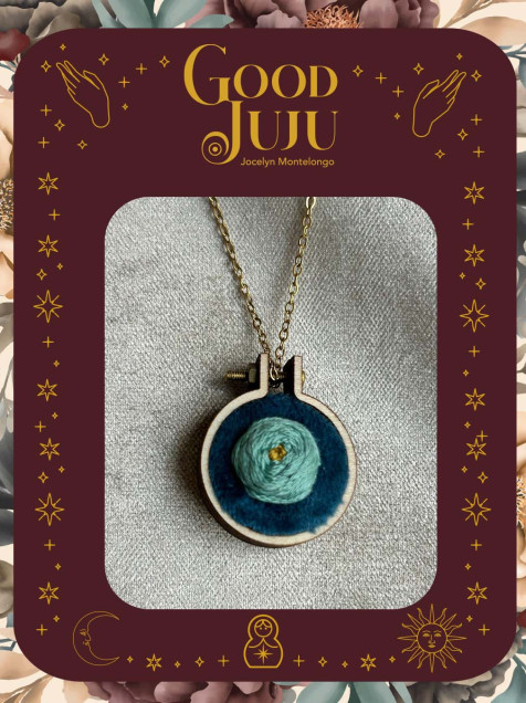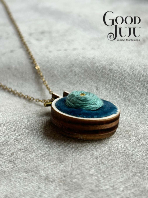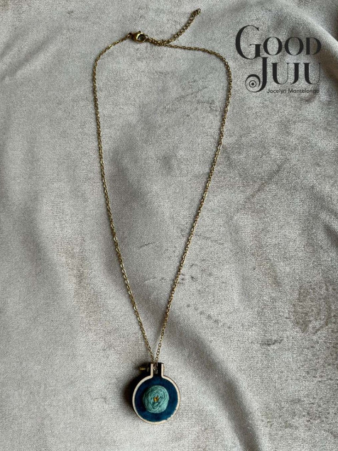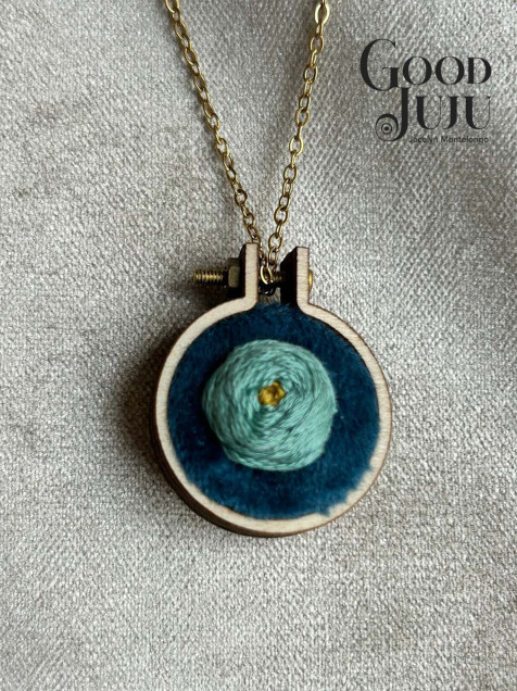 Dije en forma de aro de bordado de madera de 2 cms de diámetro, el bordado sobre terciopelo azul está hecho con hilos de algodón de la marca DMC y Anchor, se incluye cadena de acero inoxidable de 22 cms de largo, perfecta para lucir este accesorio con estilo.