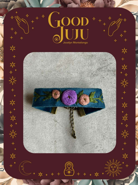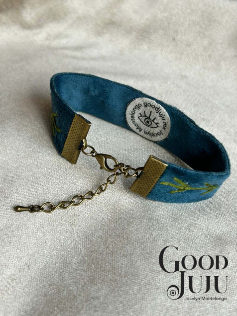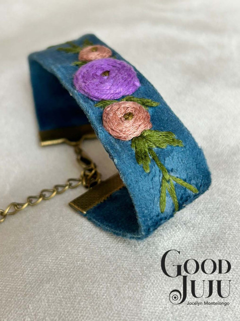 Pulsera de terciopelo azul bordado con hilo de algodón de la marca DMC y Anchor, el largo total de la pulsera es de 20 cms, el largo del bordado es 14 cms (sin tomar en cuenta la cadena) y el ancho de 2 cms con broche de latón con una tonalidad en oro antiguo.
