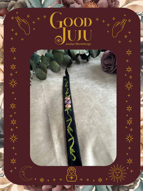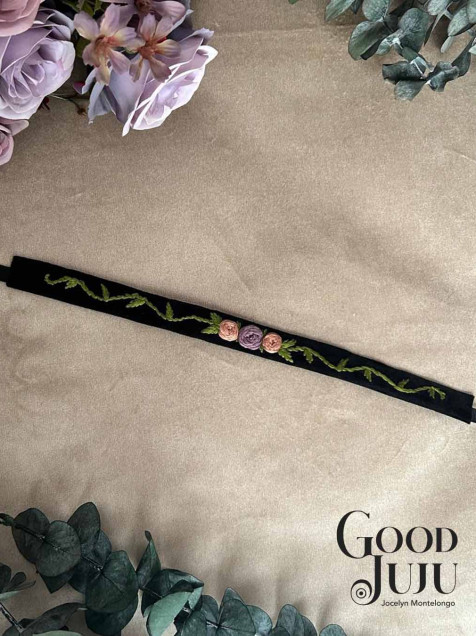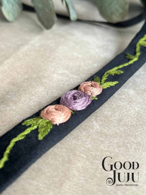 Material: terciopelo bordado con hilo de algodón de la marca DMC, incluye listón para un ajuste personalizado