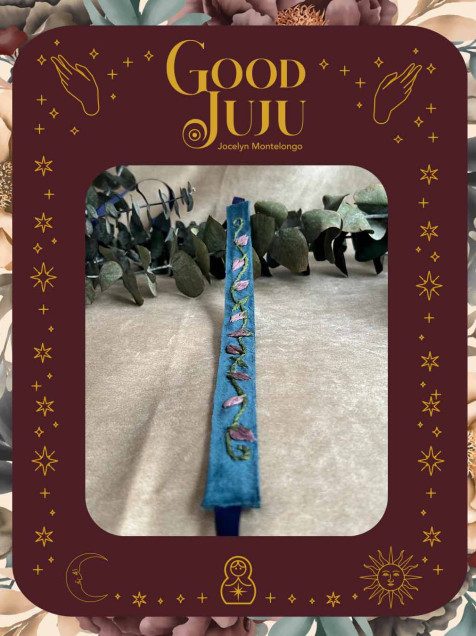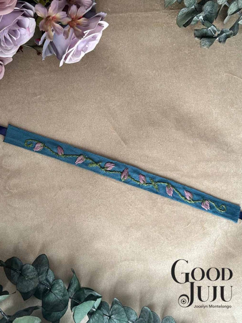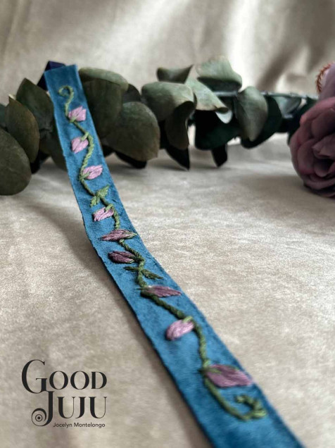 Material: terciopelo bordado con hilo de algodón de la marca DMC, incluye listón para un ajuste personalizado