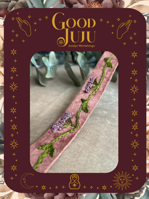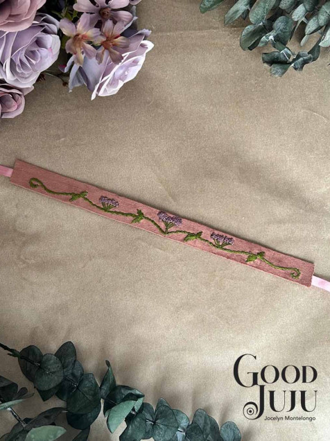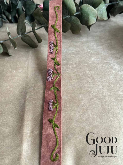 Material: terciopelo bordado con hilo de algodón de la marca DMC, incluye listón para un ajuste personalizado