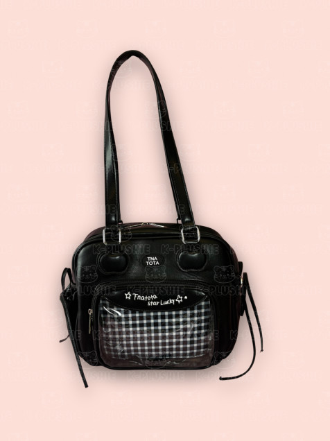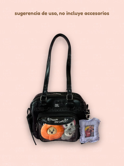 Lleva tus plushies favoritos en esta linda ita bag. Este diseño de bolsa tiene un compartimento transparente al frente con cierre para que lleves tus peluchitos de forma segura 🫶🏻 Tiene un compartimento principal con cierre doble metálico, un pequeño bolsillo interior con cierre, dos bolsitas laterales con cordoncitos y una argolla al frente en la que puedes colgar un photocard holder o un charm 🥰 Medidas aprox: 24 cm largo, 21 cm alto (sin contar las asas) x 10 cm de ancho.