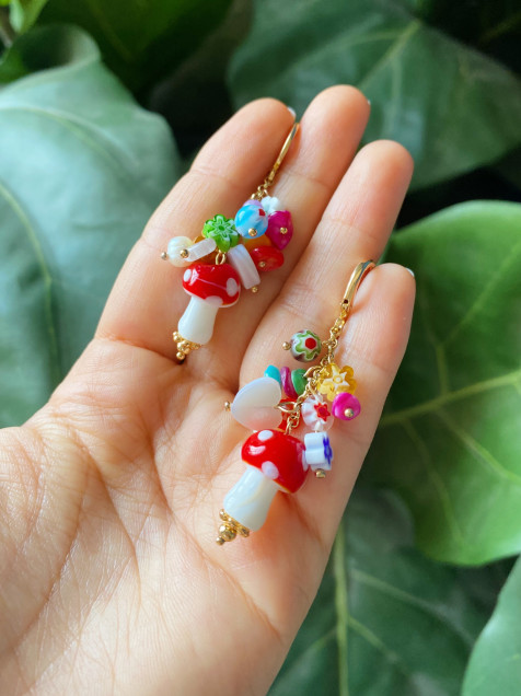 Arracadas de chapa de oro, con dijes: hongo de cerámica, flores millefiori, corazones de madre perla y perlas de río.