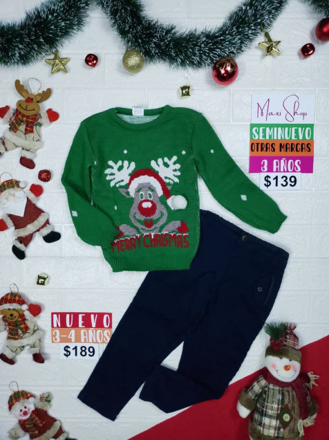 Suéter tejido con estampado de reno y pantalón azul talla 3