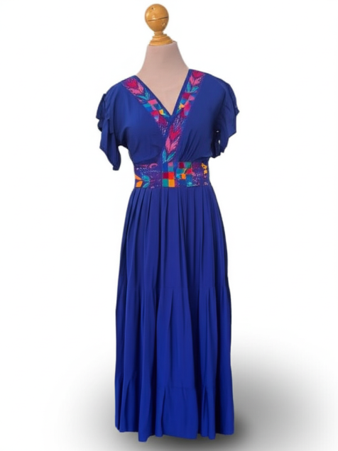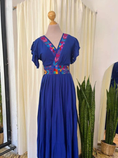 Vestido Ximena con cuello en V brocado en telar de cintura.