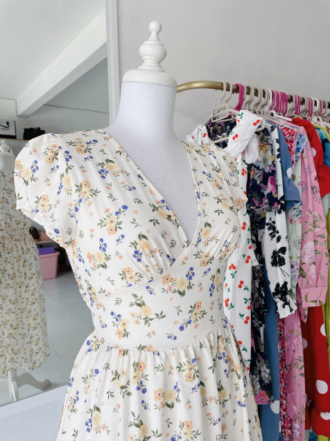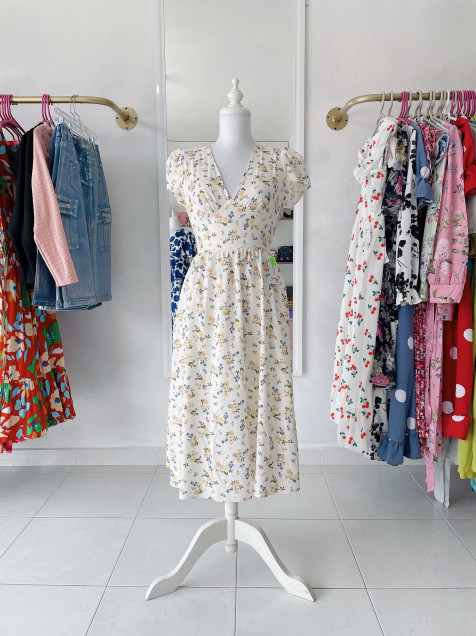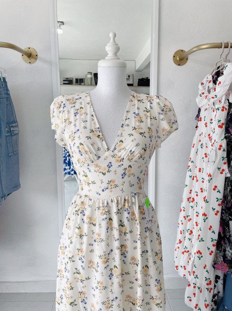 Vestido de florecitas, bolsas en falda, cuello en V