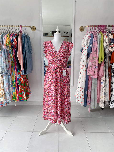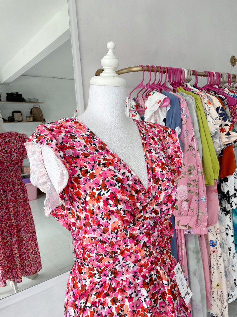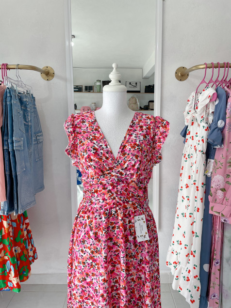 Vestido ligeramente fruncido del busto, con olanes en las mangas, elástico en la cintura por detras.