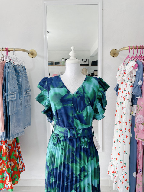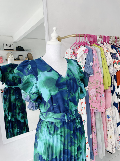 Vestido cuello en V, cinturón ajustable, manga con Olán, falda plisada