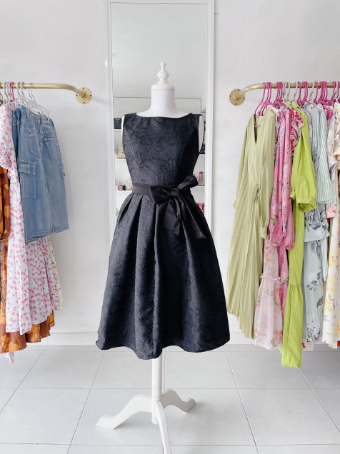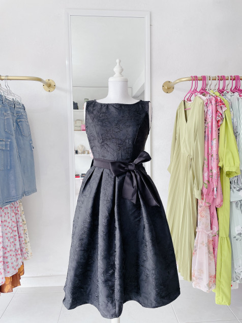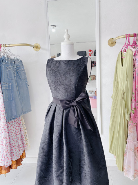 Vestido ampón, zipper en la espalda, moño al frente.