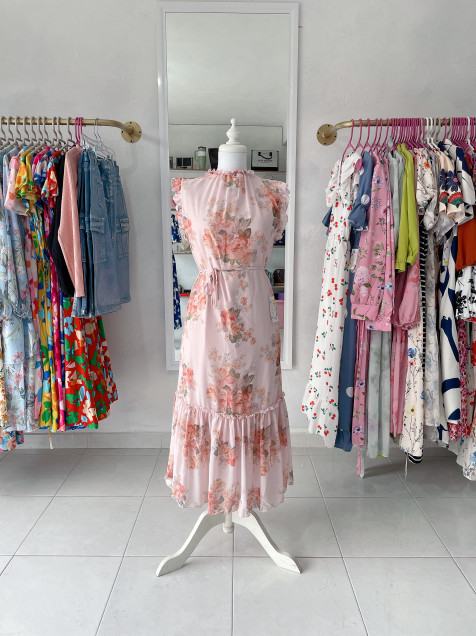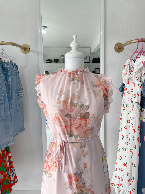 Vestido rosa de gasa sin manga, cinto ajustable, Olán en el cuello