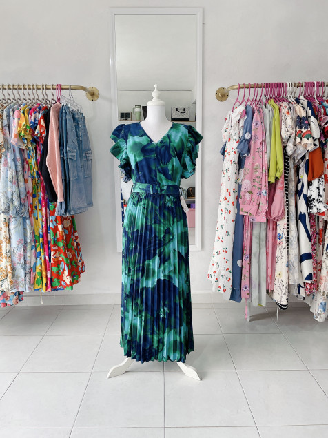 Falda plisada con cinturón ajustable, manga con Olán, cuello V
