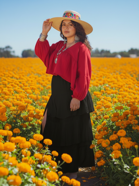 Esta falda celebra la libertad y la frescura del movimiento, evocando los días soleados y la alegría del color artesanal.