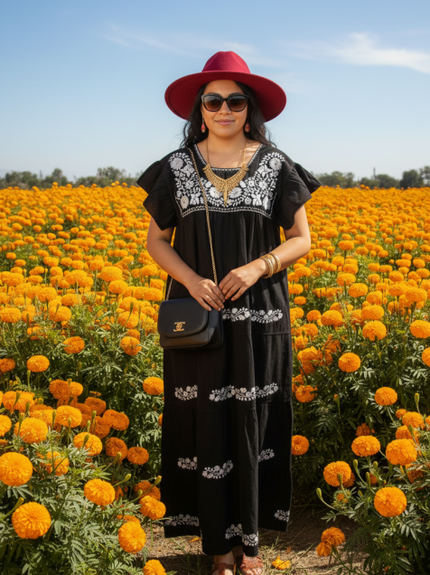 Vestido artesanal elaborado artesanalmente en manta y bordados a mano de ambos lados largo 130cm talla g