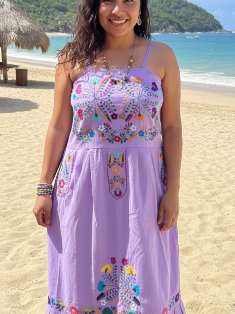 Este hermoso vestido Lirio está hecho a mano con manta artesanal, ofreciendo una combinación perfecta de comodidad y elegancia. Su diseño floral bordado con detalles delicados en cada pétalo resalta la belleza de la tradición reflejando el arte y la cultura de nuestra tierra. Con un largo de 120 cm, es ideal para cualquier ocasión, desde una tarde casual hasta eventos más especiales.