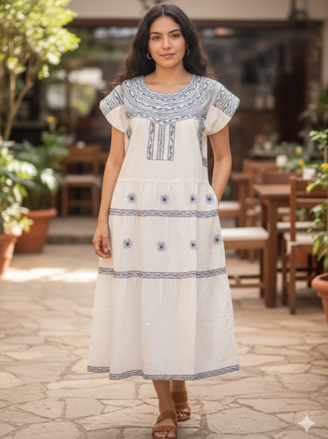 Luce este precioso vestido cafetalero, una pieza única con bordados artesanales que celebran la tradición del café. Ligero y cómodo, perfecto para esos días de calor con un toque artesanal muy chic.