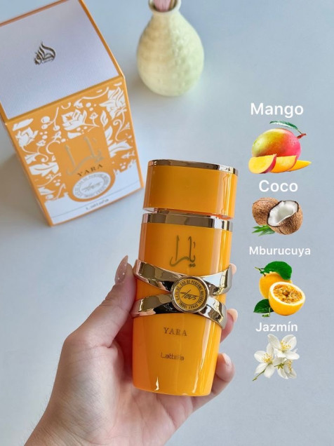 Yara Tous de Lattafa: Un perfume de dama con aroma que evoca la energía del sol. Su envase naranja vibrante, con detalles metálicos dorados, refleja una fragancia audaz y sofisticada. Un toque de lujo para tu día a día.