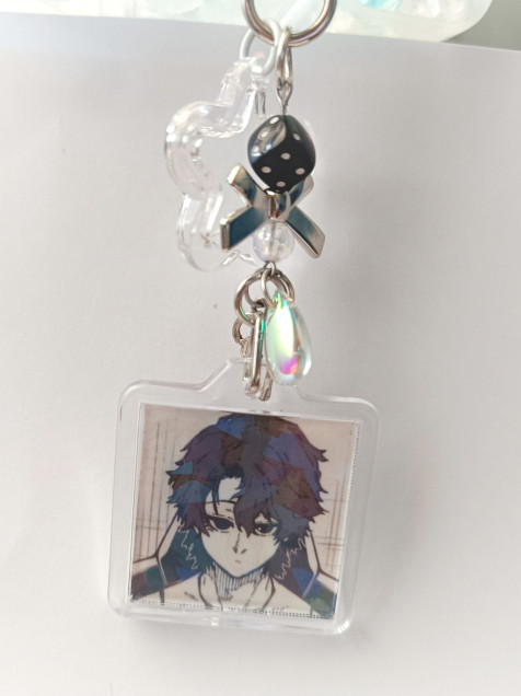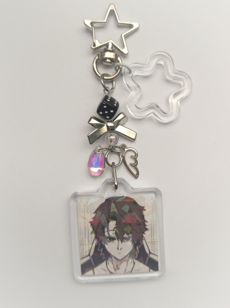 Llavero de acrílico de Hugo decorado con cuentas de acrílico, resina y plástico.