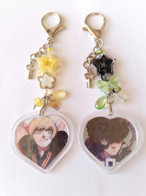 Llaveros individuales Charles y Niko con acrílico y holográfico de corazón