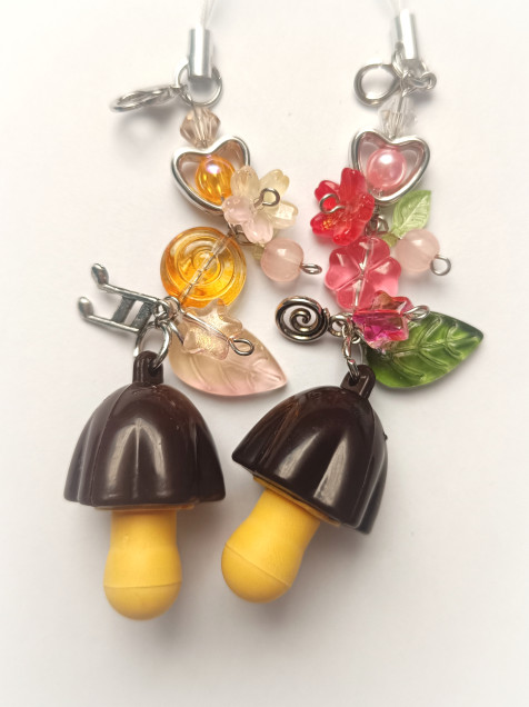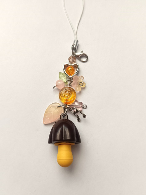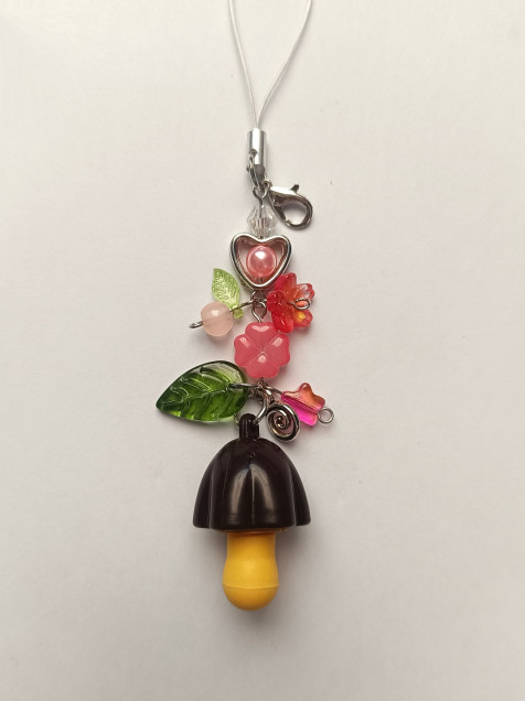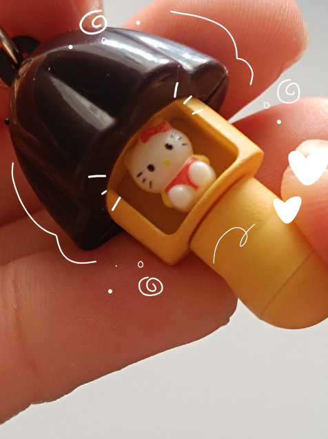 Llavero con pequeño trinket de hongo con una mini hello Kitty en su interior
