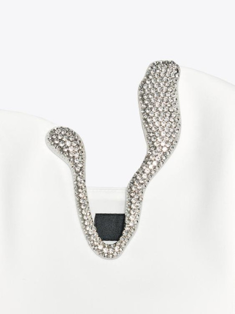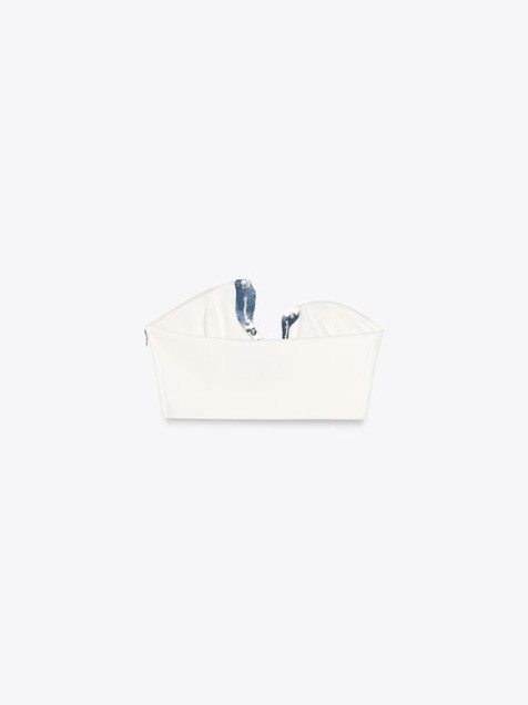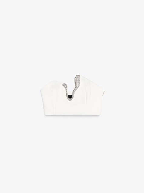Top crop de escote asimétrico con detalle de pieza metálica y aplique joyas. Forro interior combinado. Cierre lateral con zipper metálico.