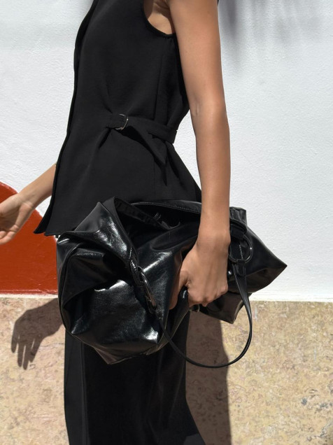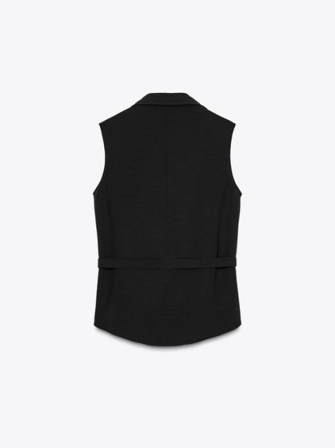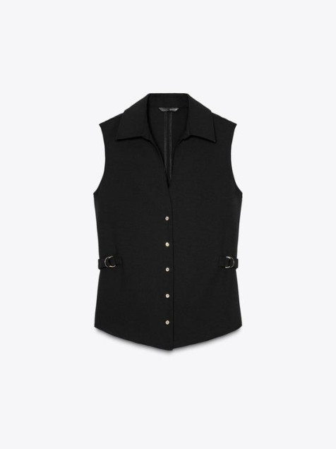Camisa de cuello solapa con escote pico y manga sisa. Cintura ajustable con trabillas con hebillas doradas. Cierre frontal con botones.