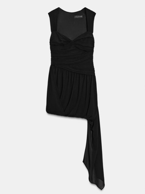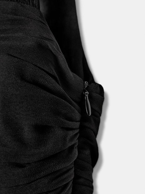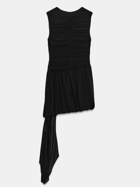 Vestido corto de escote pico y manga sisa. Bajo asimétrico y abullonado con elástico interior. Acabados con frunces. Cierre lateral con zipper oculto en costura.