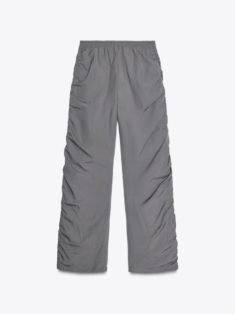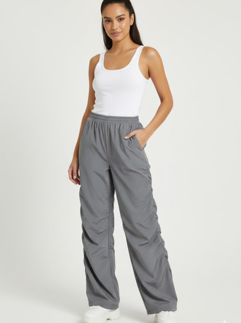Pantalón de mid waist con cintura elástica. Bolsillos laterales ocultos en costura con botón a presión. Detalle de frunces.