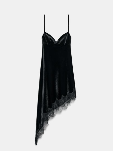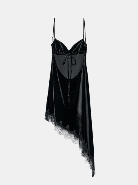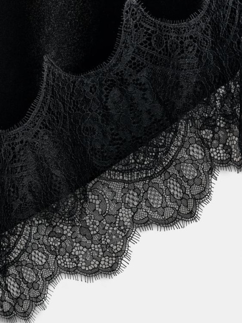 Vestido midi confeccionado en tela de terciopelo. Escote de pico y tirantes delgados ajustables. Detalle de espalda con tiras cruzadas. Bajo con acabado asimétrico y aplicación de encaje del mismo tono.