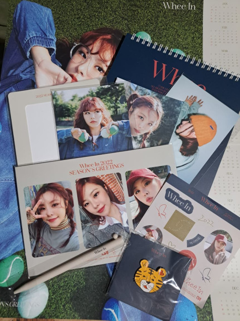 💜Incluye todo lo que ves: badge (diseñado por wheein), pluma, calendario de escritorio,set de photocard, set de postcard + porta retrato, plantilla de stickers, poster de calendario.