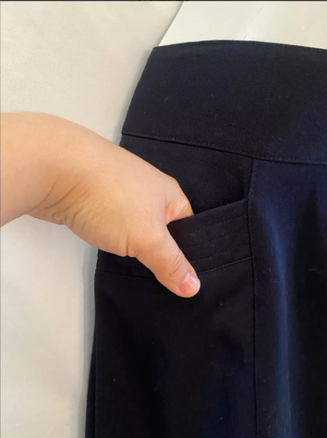 POLIESTER Y RAYON SIN FORRO, CIERRE EN PARTE POSTERIOR, BOLSOS A LOS LADOS, EL CORTE VA UN POCO MAS ARRIBA DE LA CINTURA