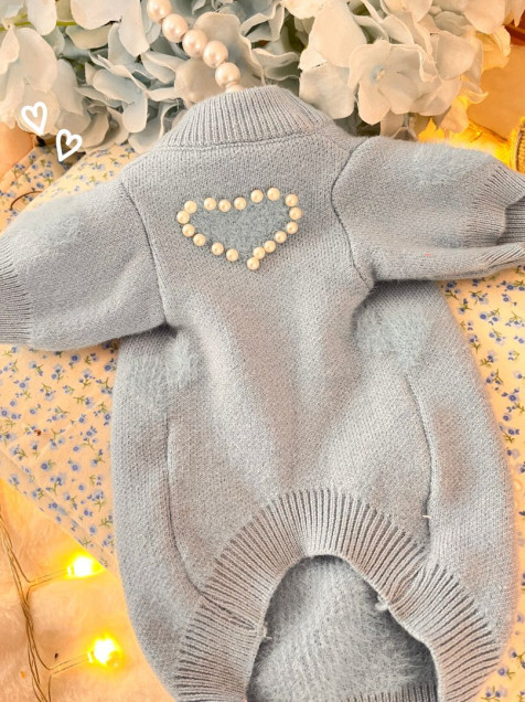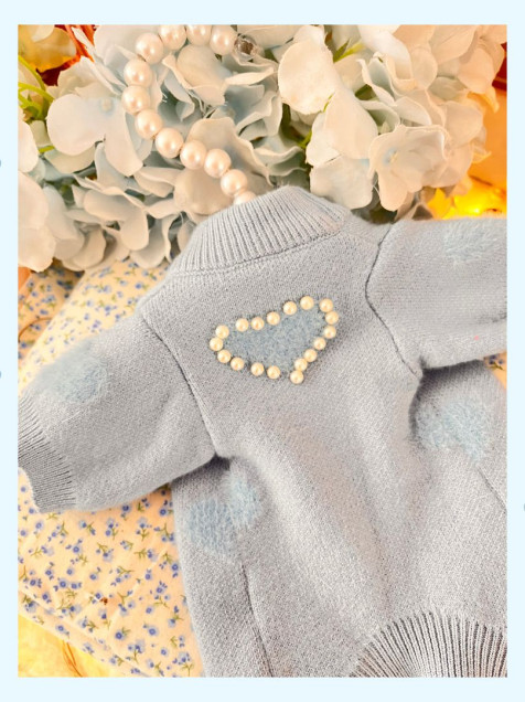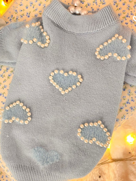 Hecho con tela suave, calientita y elástica, este suéter color azul cielo está decorado con corazones y perlas, dándole un toque tierno y elegante.