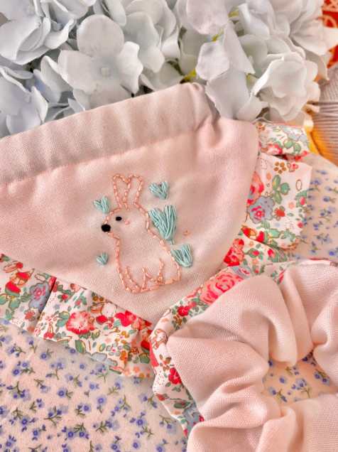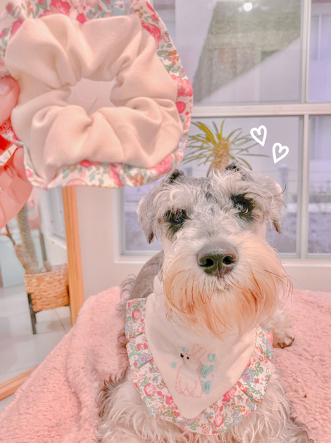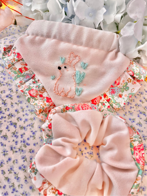 Incluye una bandana mediana con un bordado de conejito hecho a mano, un collar a juego y una scrunchie para la dueña, ¡porque ambos merecen lucir adorables juntos! 💕