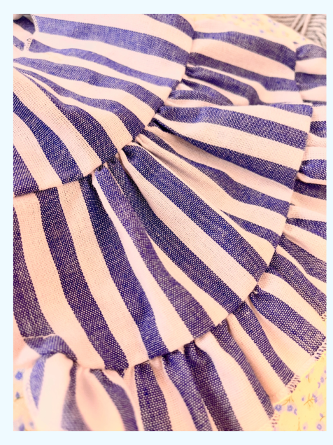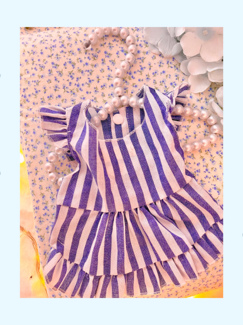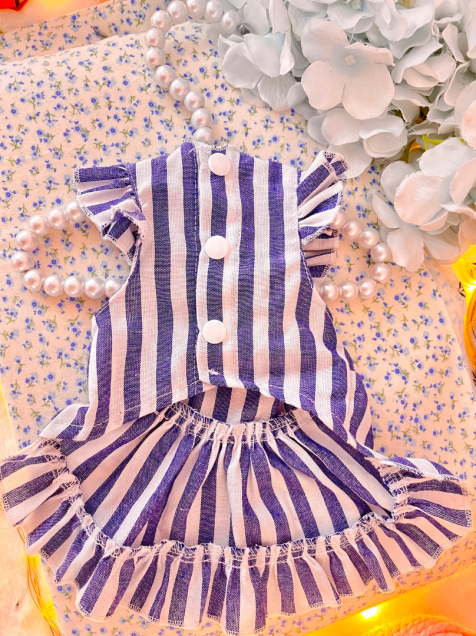Hecho con poliéster ligero, combina comodidad y elegancia en un diseño azul con delicadas rayas blancas y tres botoncitos frontales que le dan un aire coqueto y encantador 🌊✨.