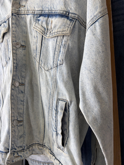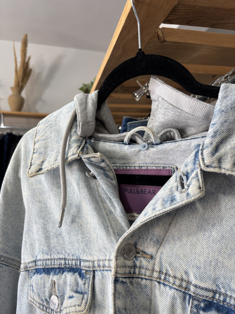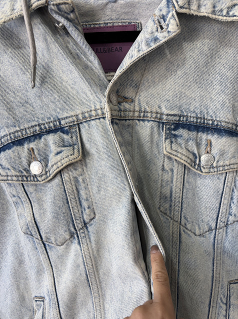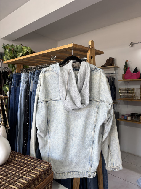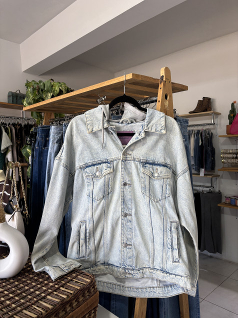 chamarra mezclilla con gorrito desmontable, es larguita. Es tallaje de hombre a una talla L de mujer queda oversize también queda a XL mujer