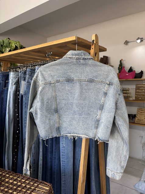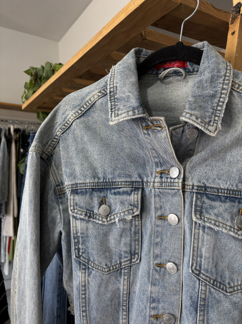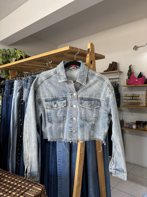 Chamarra de mezclilla corta, segunda mano pero la verdad está como nueva. Era mi la usé solamente una vez. Dice talla S pero queda mejor a M