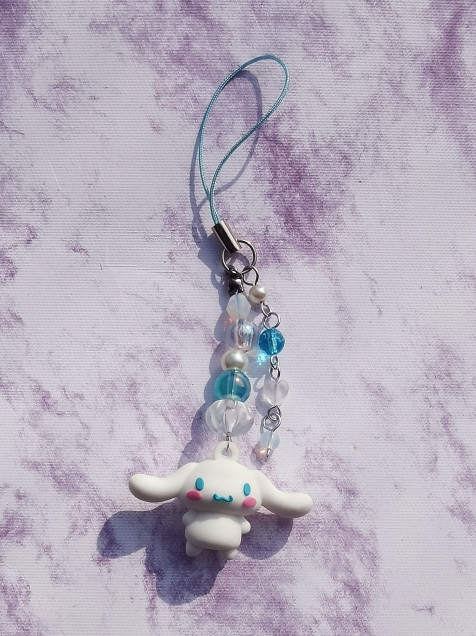 Strap para celular de Cinnamoroll elaborado con cuentas de cristal, acrílico, opalita y perlitas:3
