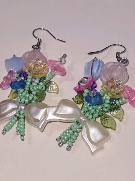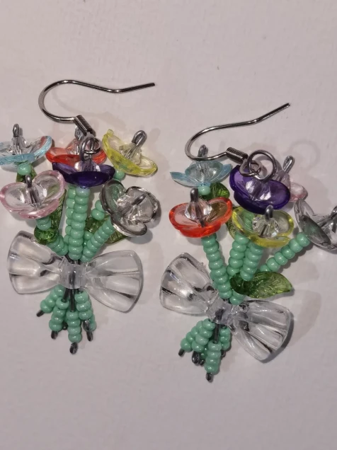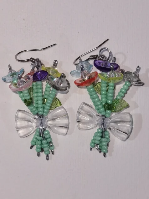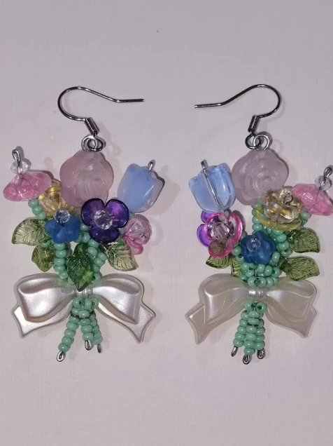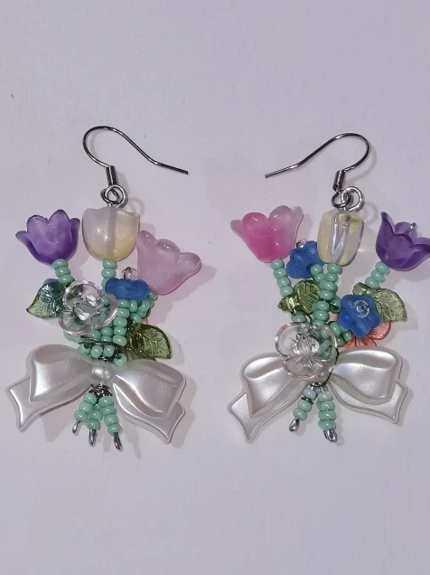Aretes de Ramos de flores elaborados con cuentas de distintos materiales y componentes de acero, el precio varía de acuerdo a la cantidad de flores que contiene cada ramo y su tipo♡