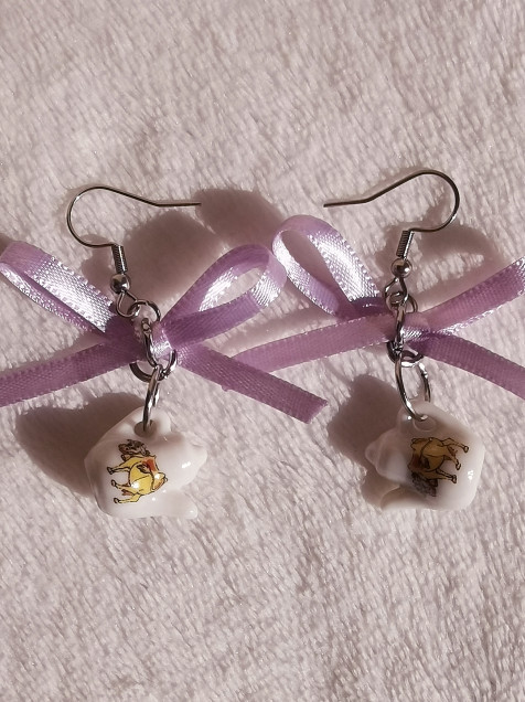 Aretes de teteras de porcelana con listón lila y complementos de aleación el moñito es cosido para mayor seguridad