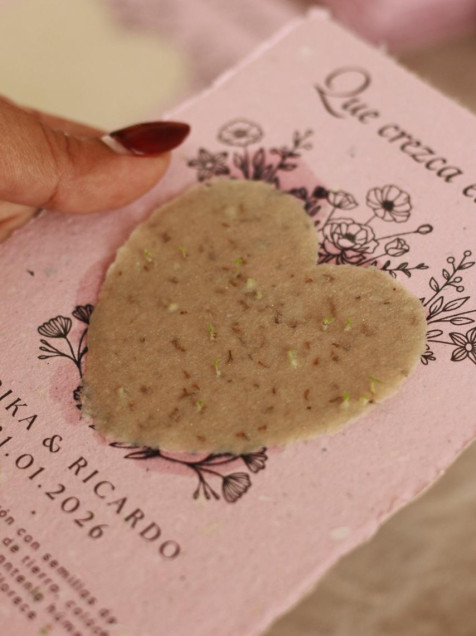 Este corazón de papel plantable está hecho a mano con fibras recicladas y semillas integradas, listo para transformarse en vida. Viene acompañado de una tarjeta artesanal personalizada, perfecta para bodas, recuerdos, eventos especiales o regalos con intención.