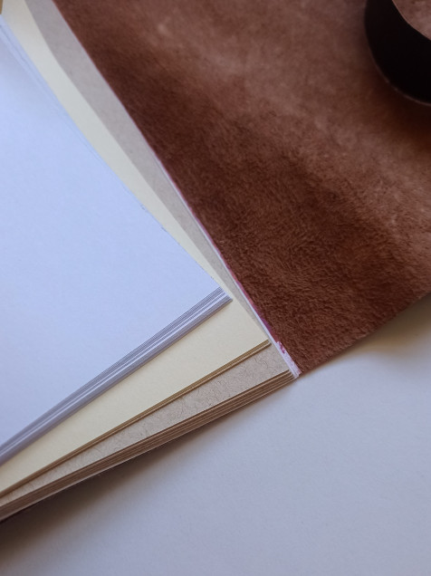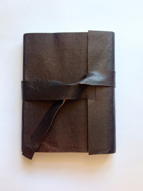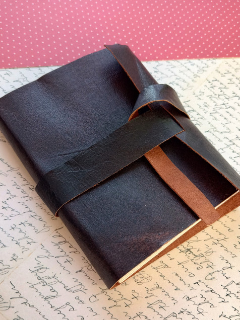 •Bitácora flexible de piel natural color café con cinta para cerrar