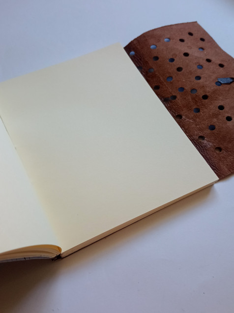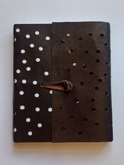 •Bitácora flexible de piel natural color café con botón para cerrar