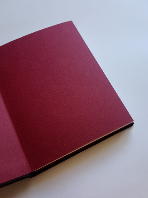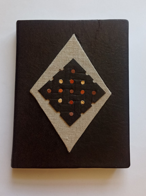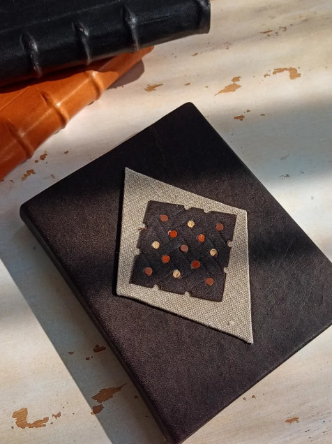 Libreta de tapas duras forrada con piel y decoración geométrica en piel y lino
