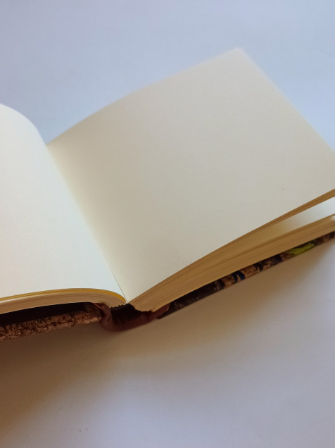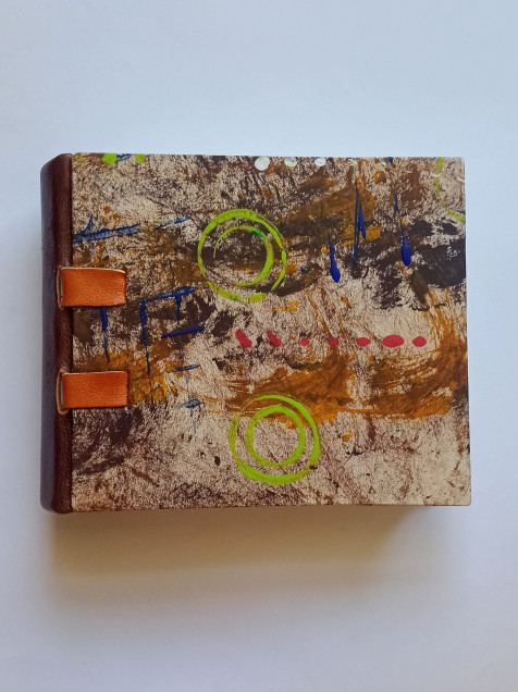 Libreta de tapa dura con lomo curvo y cintas de piel. Tiene papel decorado a mano en la portada